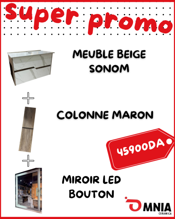 Profitez d’un ensemble élégant et fonctionnel composé du meuble Sonom, une colonne Maron et d’un miroir LED moderne, le tout à seulement 43 500 DA !