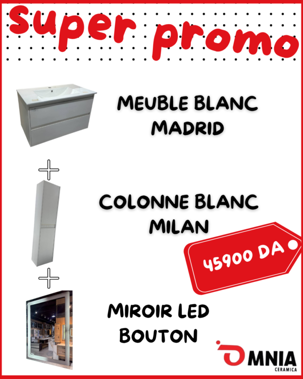 Profitez d’un ensemble élégant et fonctionnel composé du meuble Madrid, de la colonne Milan et d’un miroir LED moderne, le tout à seulement 43 500 DA !