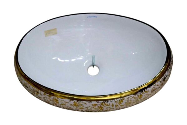 Apportez une touche de raffinement classique avec cette vasque à poser ovale ornée de motifs dorés élégants sur fond blanc.